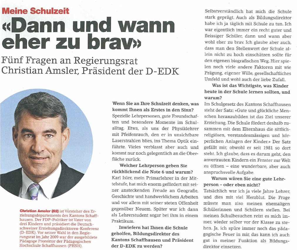 Regierungsrat Christian Amsler (FDP), Vorsteher Erziehungsdepartement des Kantons Schaffhausen (Bildung, Jugend, Familie, Sport und Kultur), Präsident der Deutschschweizer Erziehungsdirektoren Konferenz (D-EDK). Vor seiner Wahl Gemeindepräsident, Fraktionschef im Kantonsrat und hauptberuflich tätig als Prorektor der Pädagogischen Hochschule Schaffhausen (PHSH).