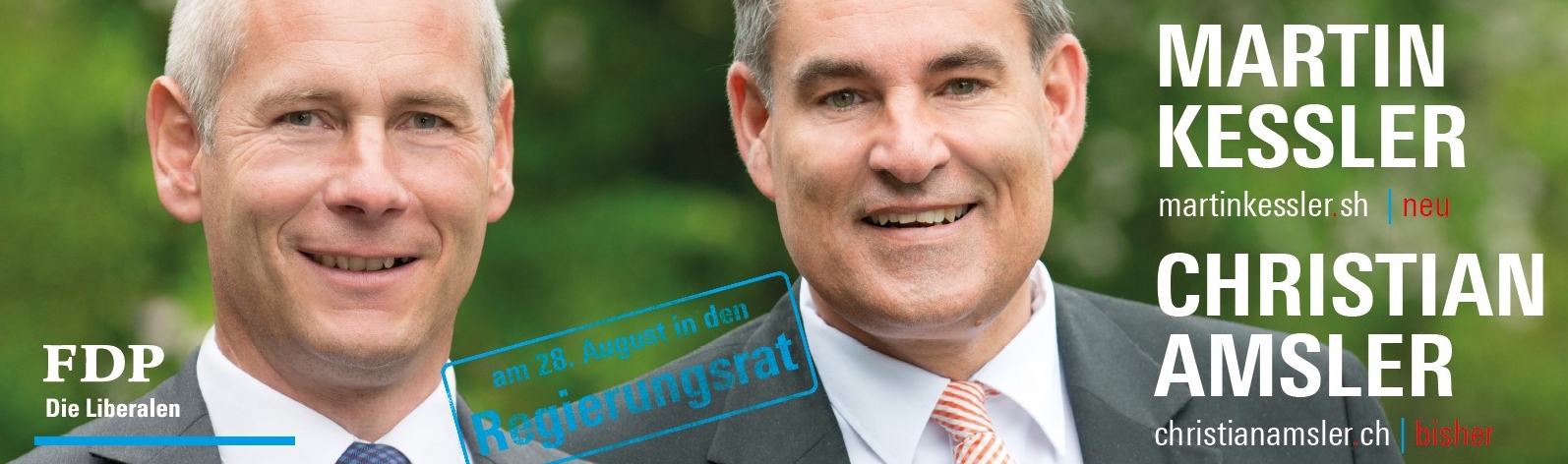 Christian Amsler (1963) und Martin Kessler (1968) setzen sich für einen attraktiven Wohn- und Wirtschaftsstandort Schaffhausen ein, mit einem besonderen Augenmerk auf Arbeits- und Ausbildungsplätze. Dazu gehören auch ein ansprechendes Lebensumfeld für Familien und attraktive Verkehrsverbindungen auf Strasse und Schiene. Auf den beiden Webauftritten www.christianamsler.ch und www.martinkessler.sh findet sich der überzeugende Leistungsausweis der beiden FDP Kandidaten.