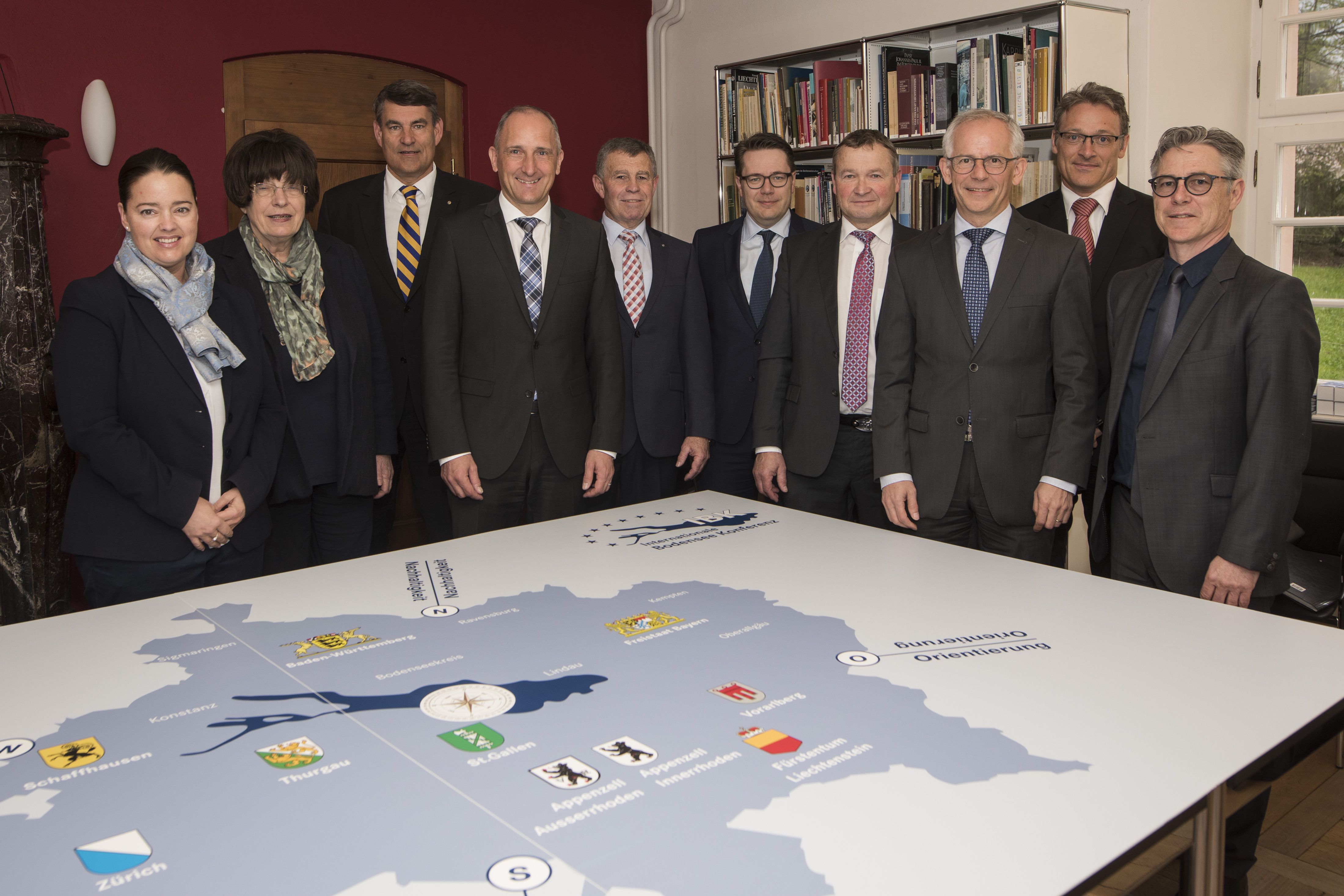 (Von links) Regierungsrätin Carmen Haag, Thurgau; Staatsrätin Gisela Erler, Baden-Württemberg; Regierungsrat Christian Amsler, Schaffhausen; Regierungschef Adrian Hasler, Fürstentum Liechtenstein (Vorsitz); Regierungsrat Ernst Stocker, Zürich; Regierungsrat Benedikt Würth, St.Gallen; Regierungsrat Alfred Stricker, Appenzell Ausserrhoden; Bauherr Stefan Sutter, Appenzell Innerrhoden; Klaus Ulrich, Referatsleiter für Internationale Beziehungen der Bayerischen Staatskanzlei und Regierungssekretär Horst Schädler, Fürstentum Liechtenstein.