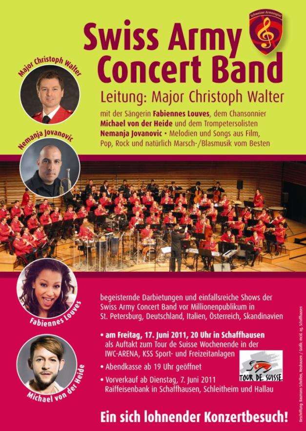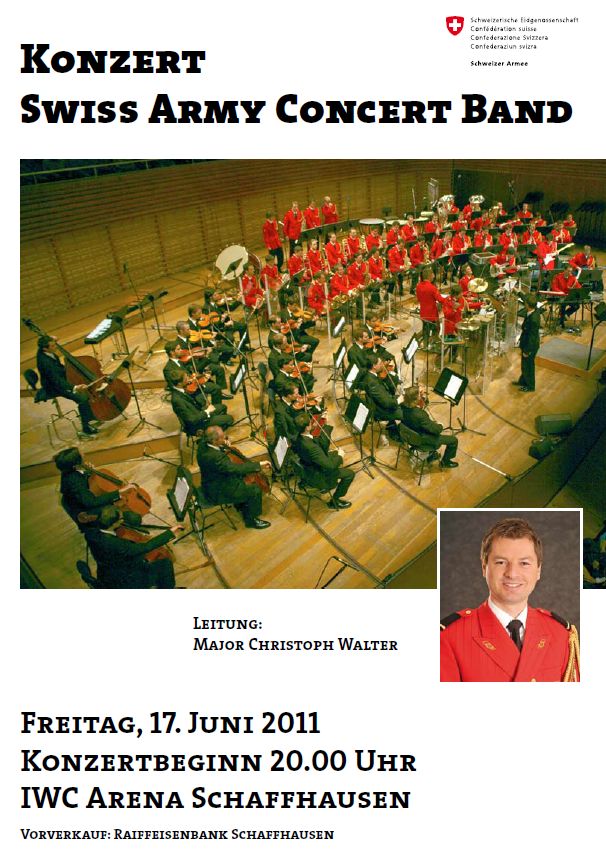 Heute Abend konzertiert die bekannte und beliebte Swiss Army Band in der IWC Arena auf der KSS zum Auftakt des Tour de Suisse Wochenendes! Als OK Präsident dieses Anlasses freue ich mich darauf.