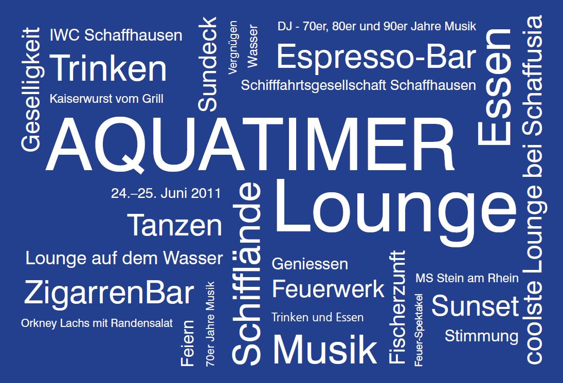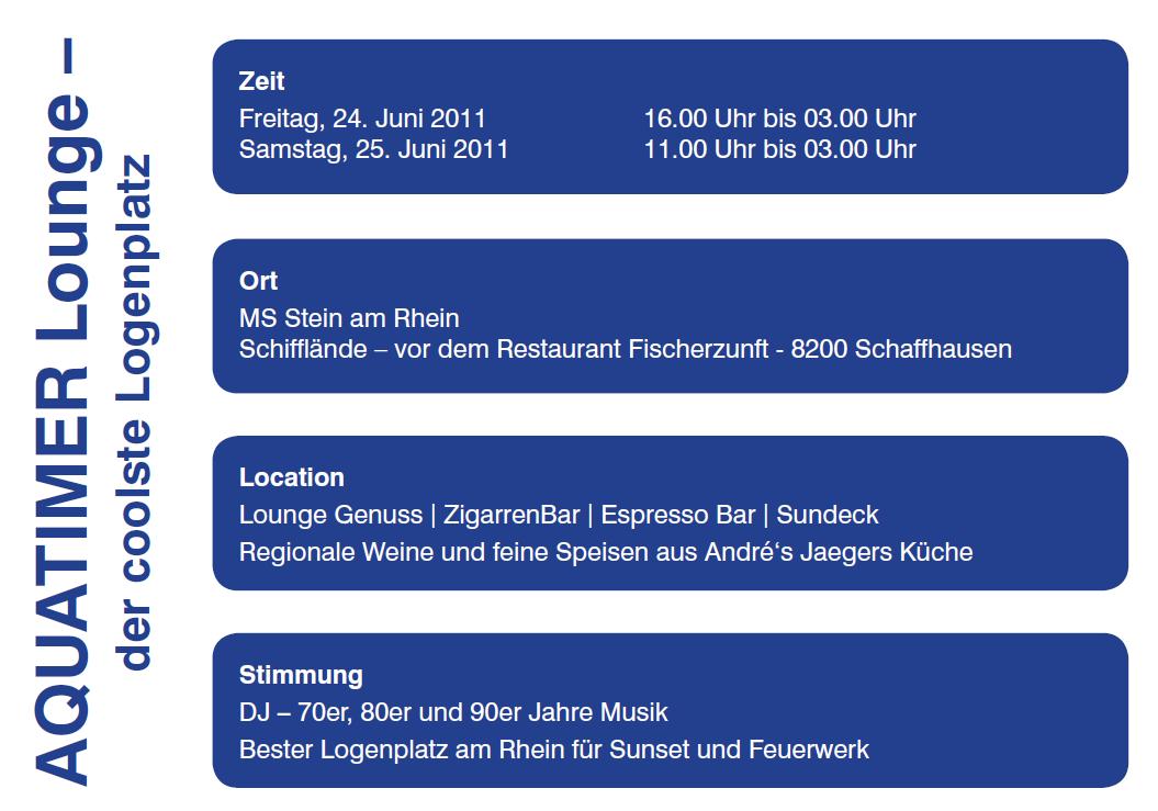 Die coolste Lounge an Schaffusia schwimmt auf dem Rhein. Trinken, Essen, Rauchen, Tanzen …. der Genuss steht auf dem MS Stein am Rhein im Vordergrund. In Zusammenarbeit zwischen Fischerzunft, Schifffahrtsgesellschaft und IWC bietet die Aquatimer Lounge den besten Rahmen dazu. Zusammen mit Prominenten und Kollegen unterstützen wir die Crew der Fischerzunft im Service bei einem der Highlights von Schaffusia.