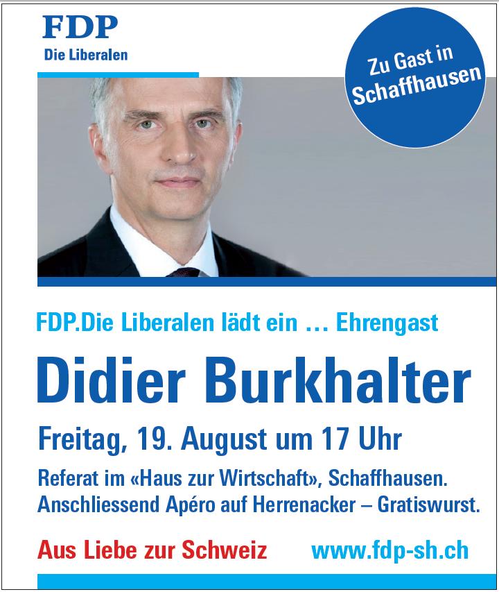 Ein grosses Fest der FDP Familie! Zuerst spricht Didier Burkhalter im Haus der Wirtschaft und nachher gibts Wurst und Brot auf dem Herrenacker.