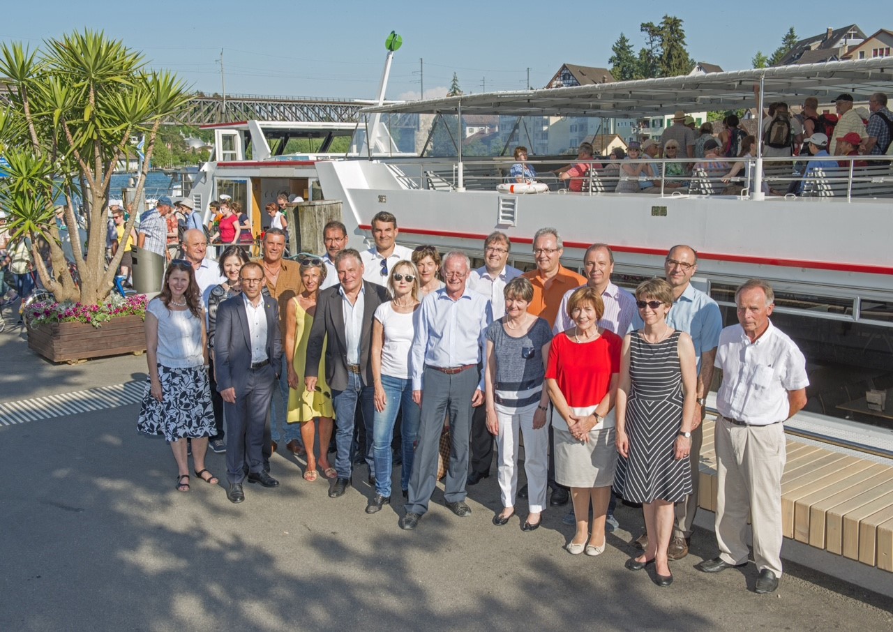 Die Walliser und Schaffhauser Regierung mit ihren Ehepartnern an der Schifflände Schaffhausen. Mitglieder des Walliser Staatsrates sind Esther Waeber-Kalbermatten (3. von links), Oscar Freysinger (hinten, 5. von links), Präsident Jacques Melly (4. von links mit dunk^lem Veston), Jean-Michel Cina (direkt beim Lüftungsschlitz des Schiffes), Staatsschreiber Philipp Spörri und Maurce Tornay (direkt anschliessend)