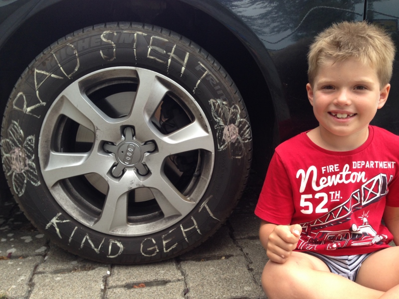 RAD STEHT, KIND GEHT: Gerne unterstütze ich die Kampagne des TCS und der Polizei zum Schulstart, damit Kinder wie mein Nachbarsbub Philipp (seit heute stolzer Erstklässler) auch weiterhin sicher zur Schule gehen können! Auf den Schweizer Strassen verunfallen jährlich 530 Kinder als Fussgänger. Sechs Unfälle enden dabei leider tödlich. Um ein Zeichen zu setzen gegen die vielen Verkehrsunfälle mit Kindern verbreiten wir gemeinsam den Slogan „Rad steht, Kind geht!".