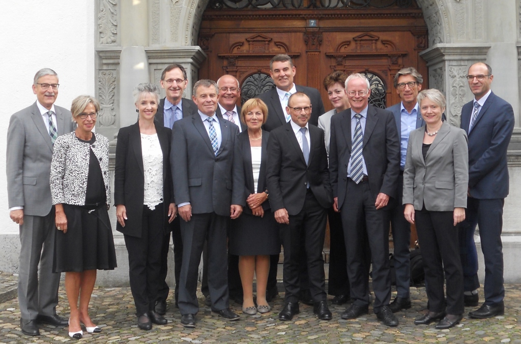 von links nach rechts: Beat Husi (Staatsschreiber ZH), Rosmarie Widmer Gysel, Carmen Walker-Späh, Mario Fehr, Ernst Stocker (Regierungspräsident ZH), Markus Kägi, Ursula Hafner-Wipf, Christian Amsler, Ernst Landolt (Regierungspräsident SH), Silvia Steiner, Reto Dubach, Thomas Heiniger, Jacqueline Fehr, Stefan Bilger (Staatsschreiber SH)
